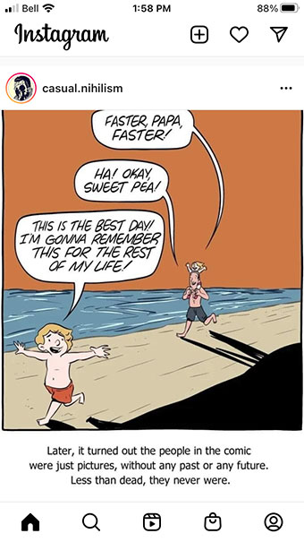 Those who want to discredit the reality of serious claims for social justice, the legitimacy of the environmental crisis, and so forth, will use the representational falsity of all culture as arguments that all positions are equally falsified representations, your lies as opposed to mine: there is no right or wrong, no truth; all reality is relative, all representation is inherently false. Your news is Fake News. Maybe mine is too. All news is Fake News and I like my Fake News better. Unfortunately, there is probably an element of truth in this irresponsible and uncaring attitude.