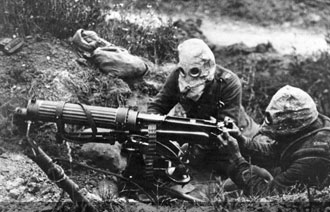 Machine gunners in WWI wearing gas masks to protect themselves from the new innovations of chemical warfare.